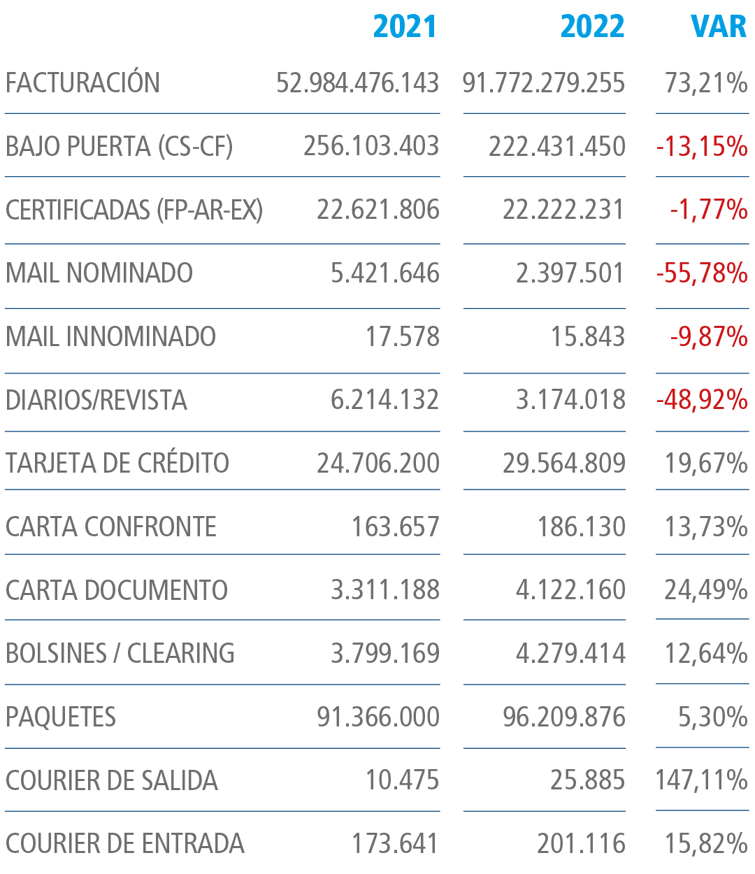 Respecto al producto de distribución de tarjeta de crédito, si bien durante los años 2018 y 2019 acumularon una baja de casi el 12%, en el año 2020/2021 por efecto de la pandemia el consumidor se volcó a las compras on line, generándose consecuentemente una mayor necesidad de uso de dinero bancarizado y la consecuente emisión de tarjetas de crédito. Así entre los años 2020/2021 el volumen de envíos de tarjetas de crédito creció un 11.89%, mientras que en 2021/2022 creció 12.31%.