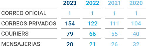 En el Registro Nacional de Prestadores de Servicios Postales se registraron 49 nuevas inscripciones durante el año 2023. De esas inscripciones 16 corresponden a empresas que prestan exclusivamente servicios internacionales (Courier) mientras que el resto se han inscripto con distintos servicios y coberturas para prestar servicios dentro del ámbito nacional.